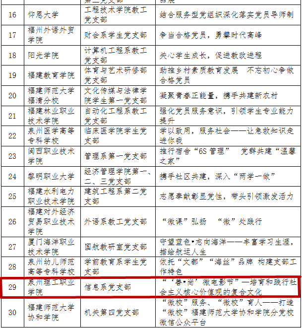 近日,中共福建省委教育工作委员会颁发了关于表彰2014-2016学年福建省高校党支部工作“立项活动”优秀成果的通知。我校信息技术系党支部《“‘善•尚’微电影节”—培育和践行社会主义核心价值观的复合文化》获得三等...
