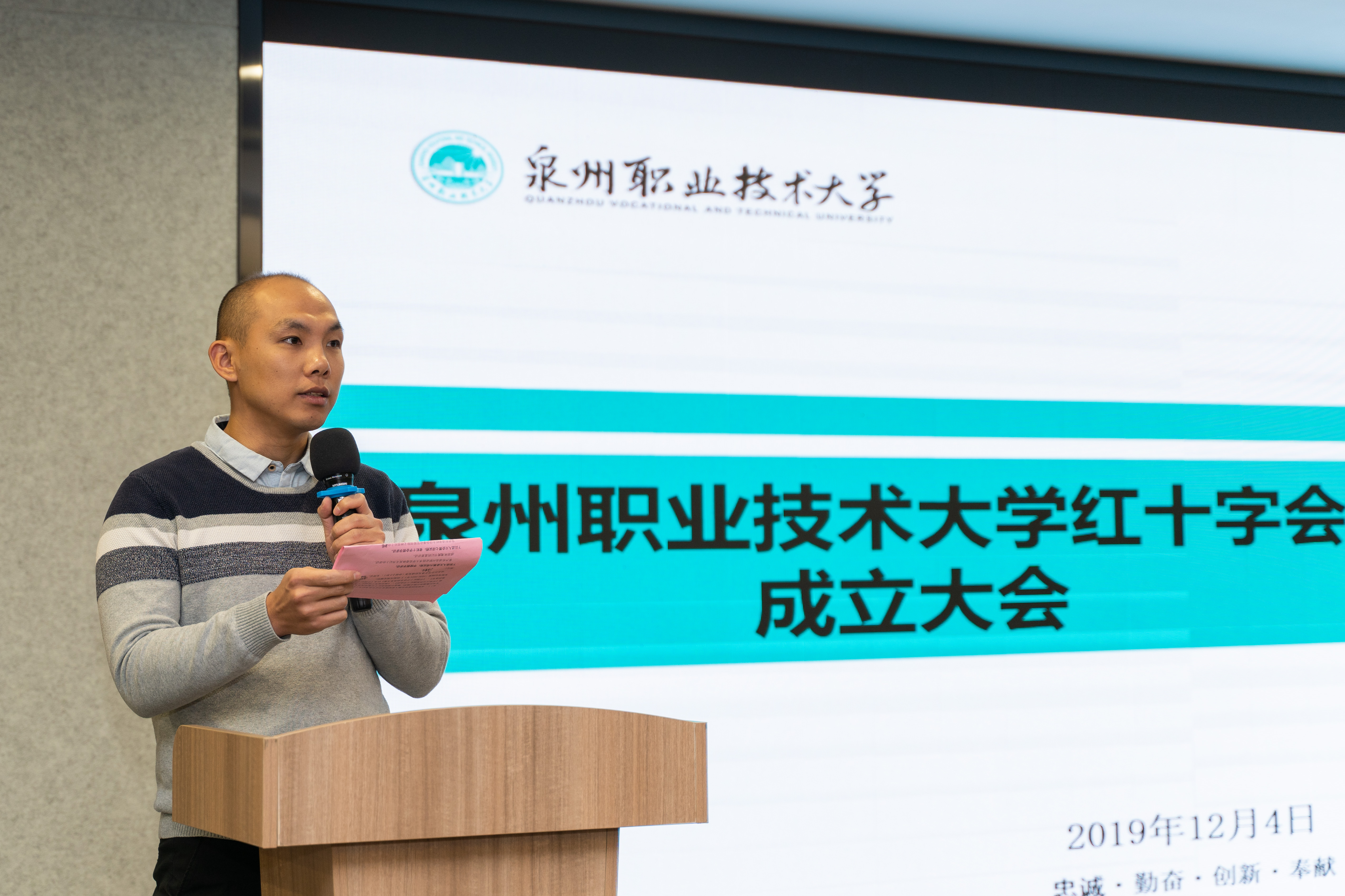 12月4日,泉州职业技术大学红十字会成立大会在我校301会议室召开,会议由八方书院书记黄胤聪主持,省红十字会事业发展部部长徐义林先生、 省红十字会事业发展部一级主任科员张松楼先生、泉州市红十字会常务副会...