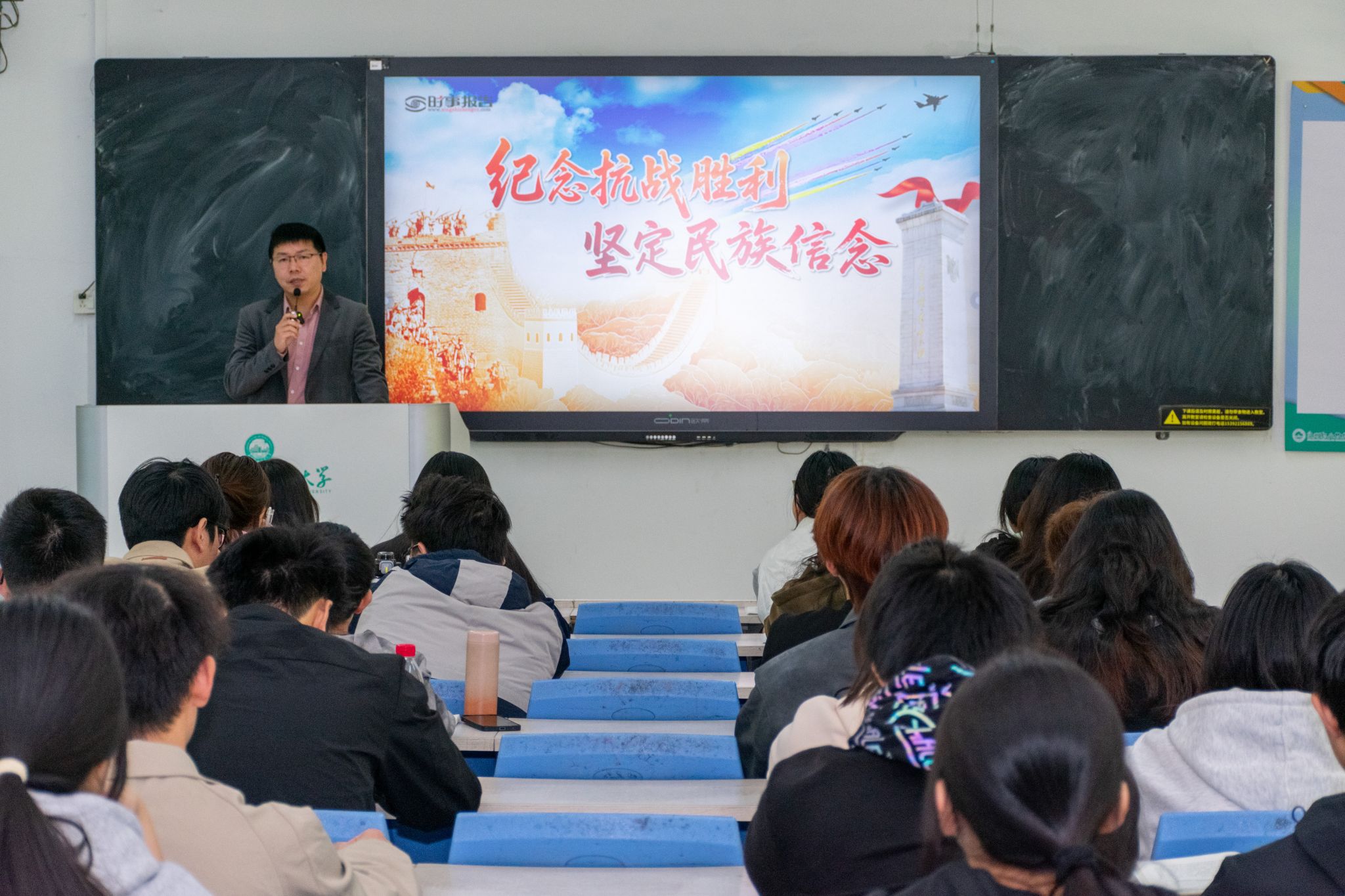 在历史的长河中,中国人民抗日战争的胜利如同一座不朽的丰碑,铭刻着中华民族的坚韧与不屈,彰显着伟大抗战精神的磅礴力量。11月25日下午,校党委副书记、副校长蔡金佩以“纪念抗战胜利,坚定民族信念”为题,为2024级酒店管理1班、2班的同学上一堂深刻而生动的思政课。蔡金佩通过为什么抗战胜利纪念日定为9月3日、中国共产党领导的敌后军民,创造出一系列巧妙战法,有效地牵制和歼灭了大量敌人等一系列珍贵的抗战历史影像,迅...