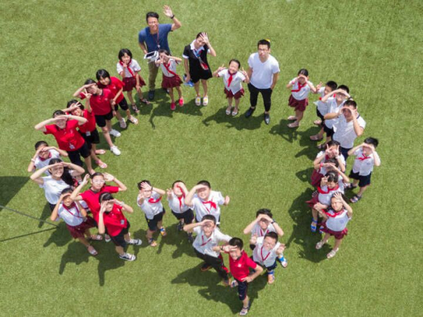 “噗……”无人机一下就窜到了半空中,引得小记者们惊叹不已。“来,我们大家抬头看天空,挥手致敬。”小记者们向着无人机招着手跳跃着,一张张欢乐的小脸蛋、一段段欢声笑语随着无人机在理工操场上漂荡……