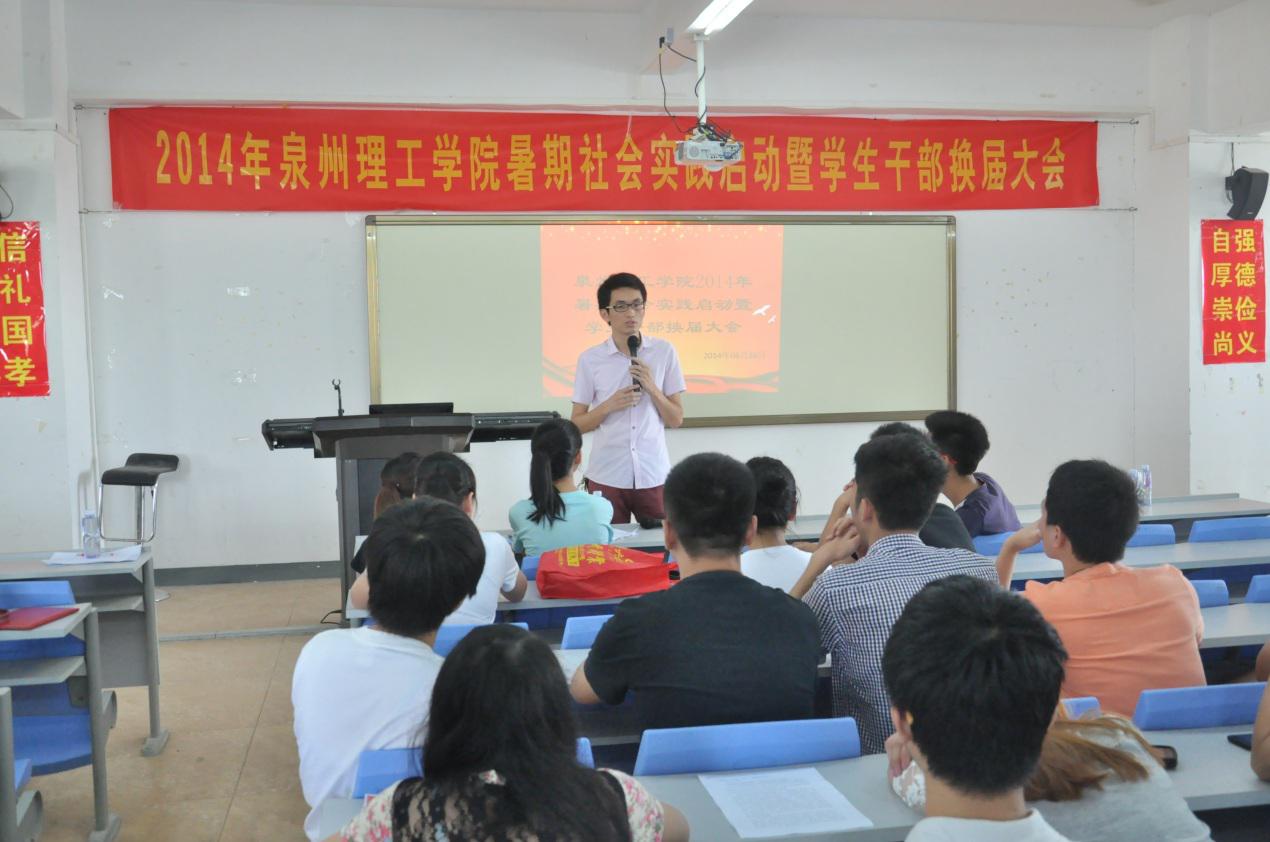 6月26日上午9:00由校团委主办的“为祖国勤学修德•以实践明辨笃实”2014年暑期“三下乡”社会实践活动启动暨学生干部换届大会在教学楼238举行。庄文瑞副校长、学工处处长杨津平、晋江市致和社工事务所主任夏晋城、校团委副书记罗敏,部分党团干部、12、13级主要学生干部以及9支实践队带队教师、队员共计150多人参加了活动。