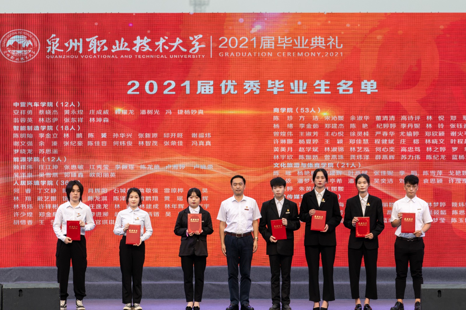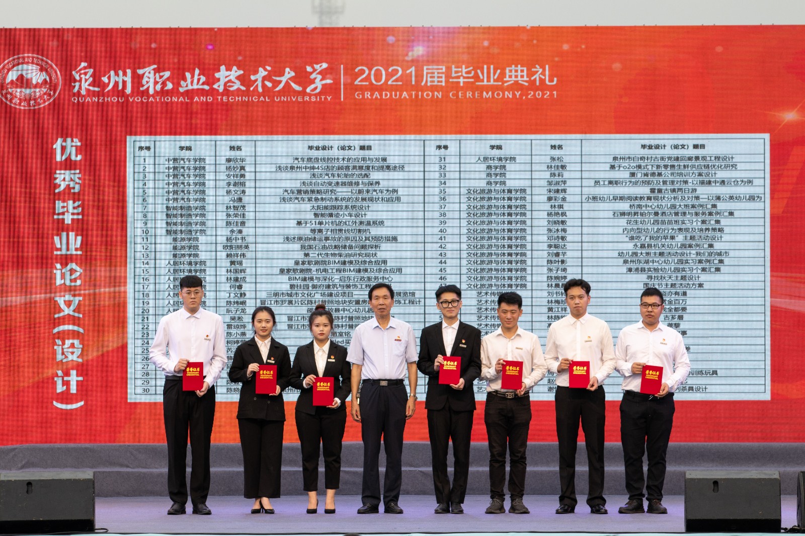 学校创办人、董事长吴金营,泉大教育基金会理事长杨培琛,校长吴滨如,校党委书记傅志雄,校务顾问、校友总会会长林其天,校务顾问、马克思主义学院院长来永宝,副董事长吴璐吟,实训基地总经理张文协,副校长姚丹、蔡金佩、庄文瑞、郭霏霏、林文艺,校长助理苏康敏,校党委委员、工会主席陈其生,党委委员杨津平,学校各学院、书院、部门领导,毕业班辅导员、班主任以及毕业生等参加毕业典礼。毕业典礼由校党委副书记、副校长蔡金佩主持。