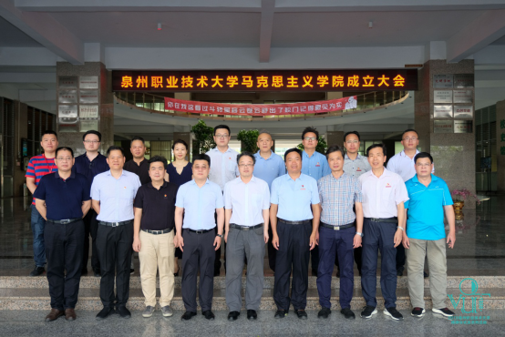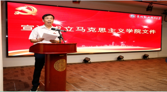 庄文瑞副校长宣读《关于成立泉州职业技术大学马克思主义学院的通知》文件, 经学校党委研究,决定在思政教研部基础上成立马克思主义学院,聘请钟君为马克思主义学院名誉院长,特聘刘小新为马克思主义学院专家组组长,特聘王福民为马克思主义学院专家,聘任林其天为马克思主义学院院长、林文艺和陈静为马克思主义学院副院长。