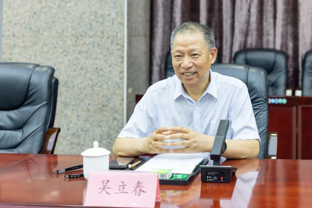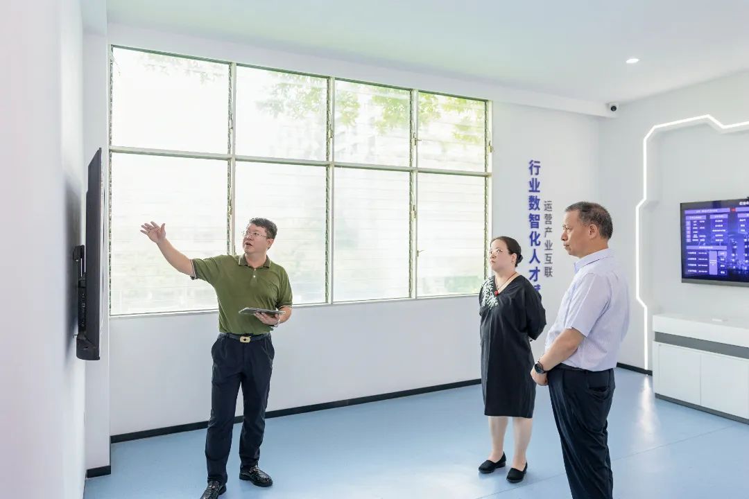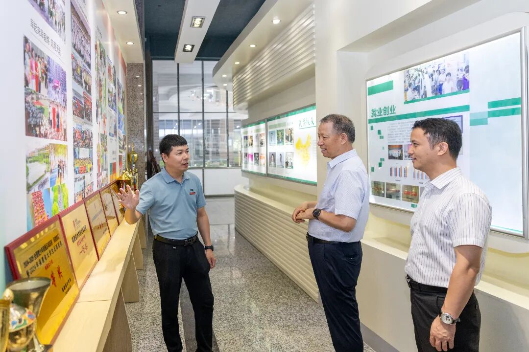 吴立春一行先后参观了我校生态校园沙盘、校史馆、艺术设计展厅、电商直播基地、数智产教融合展厅及行云新能源产业学院等教学科研场所。每到一处,校领导充分围绕学校发展沿革、校企协同机制、专业群建设成果、数智培养及产业实践等方面作系统介绍。途中,吴立春与我校创办人/董事长吴金营亲切交流,对吴金营董事长质朴务实、躬耕职教的精神深表钦佩。