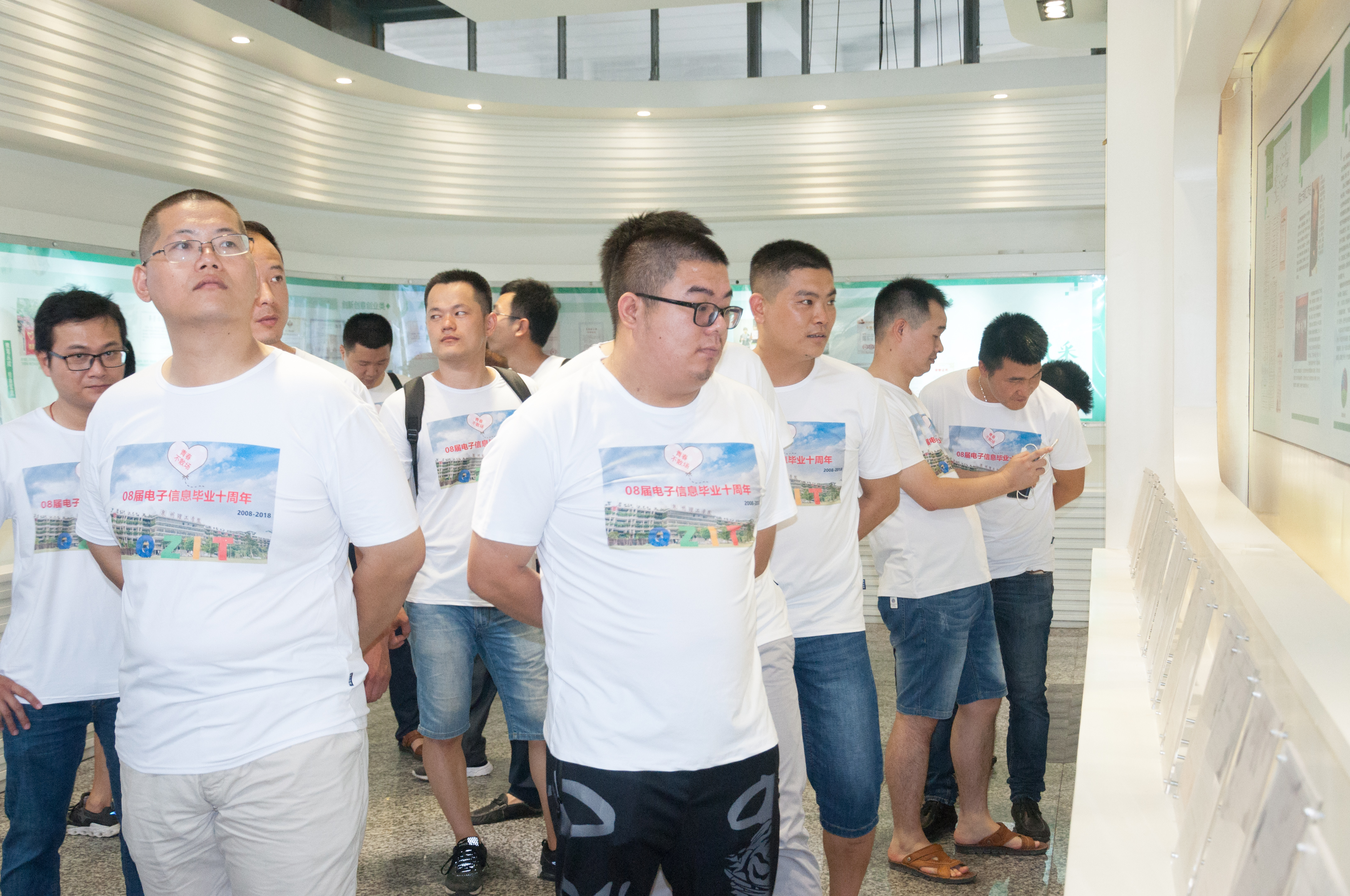 校友们穿着特制的纪念T恤,一同游览新校区,回忆校园点点滴滴。在参观校史馆后,看到学校取得的一项项傲人的成绩后,许多校友都不“淡定”了。“学校的变化真的太大了,环境更好,成绩更是喜人。”电子信息工程技术专业的傅东海高兴地说。在看到“永不止步”展区时,校友们纷纷驻足,一同回忆起曾经晨跑的日子。会计3班的陈琫珏激动地说:“看着这个展区,好多回忆都涌上来了,早锻炼真的是一生都无法忘怀的时光。”