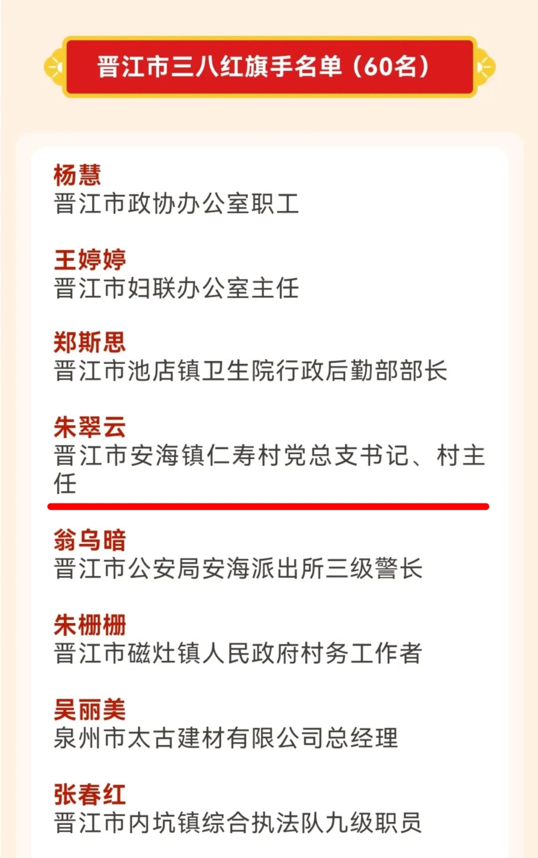 近日,晋江市妇联发布《2024年晋江市三八红旗手名单》,我校2005级工商企业管理专业校友,晋江市安海镇仁寿村党总支书记、村主任,晋江市党代表、妇女代表朱翠云被授予2024年度“晋江市三八红旗手”称号。