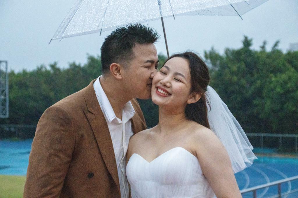 这一天,天上飘着蒙蒙细雨,校园里到处湿漉漉的。他们风雨无阻,按约定来到校园。“前两次,因为疫情等原因,迟迟不能来学校拍照。这是第三次了,我们不能再错过机会。”新郎伸出手感受细雨,他说,校园是他们相遇、相识的起点,婚纱照如果没有这里的风景,他们会感到很遗憾,即使冒雨也要赶来学校。拍照行程紧,回到母校,他们也很匆忙。新郎忙前忙后,一会给新娘递水,一会帮她提婚纱的裙摆。看着他满头大汗,新娘不时拿纸巾帮他擦拭。