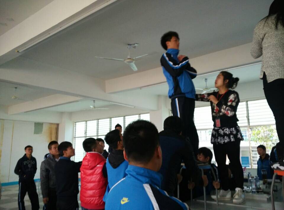 这个游戏告诉我们齐心协力做一件事,就有可能会成功。信任背摔是最后一个游戏,也是最能考验我们团结与信任的游戏,选出一名队员站在桌子上选择背摔,而其他队员则在下面肩搭肩接住上面摔下的每个队友,站在上面的队员要足够信任底下的队友,身体挺直,自然倒下,只有这样才完美完成背摔。这个游戏需要很大的勇气,虽然不知道自己身后的队友是否能接住自己,但是每组队员还是争先恐后的上去选择背摔,因为他们足够相信身后的队员是他们坚强的后盾。