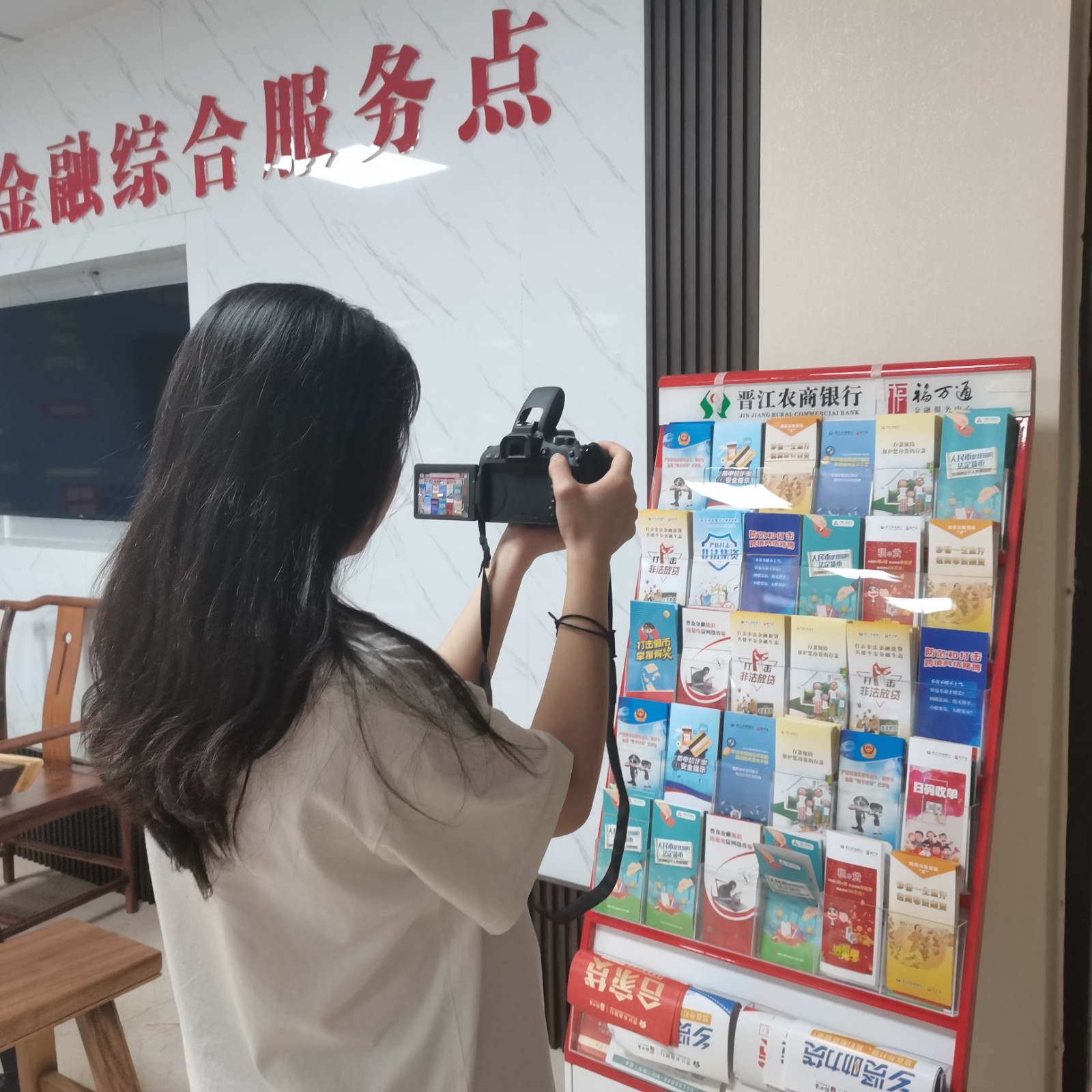 7月27日,福建省晋航农业股份有限公司工作人员与实践团成员围绕制作共享驿站宣传手册进行交流讨论。